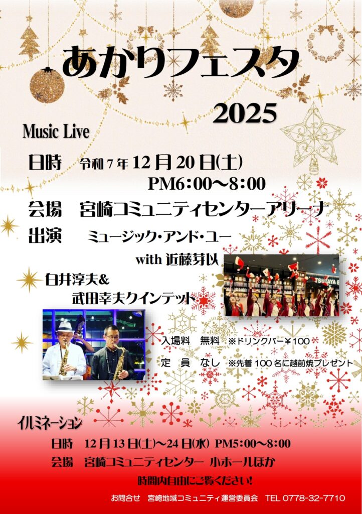 12月13日からイルミネーション公開中!20日(土)には恒例のMusic Liveも開催します。出演は白井淳夫&武田幸夫クインテット(ジャズ)、ミュージック アンド ユーwith近藤芽以(ゴスペル)の皆さんです。入場無料!ご来場ください!!